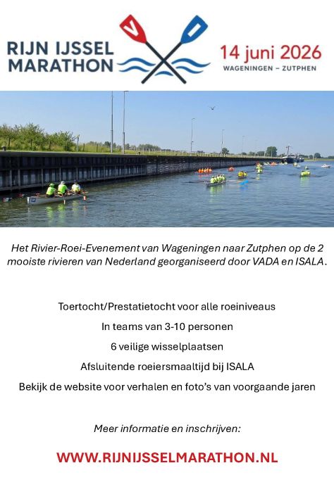 In de ochtend wordt er vanaf 7:30 uur gestart vanaf VADA. We schutten rond 10:00 uur in de sluis bij Driel met alle deelnemers tegelijk. Bij Rhederlaag/Giesbeek is ruimte om met meer boten tegelijk wat langer te pauzeren en van je zelf meegebrachte lunch te genieten. Na afloop van de tocht wordt er in Zutphen een roeiersdiner verzorgd.